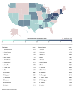 The top-performing states are heavily concentrated in the Northeast and parts of Appalachia. New Hampshire, Massachusetts, and Vermont rank first, second, and third respectively, each earning a Behavioral Health Performance Index score above 73. These states consistently performed well on metrics related to initiation, follow-up care, and evidence-based medication use, but scored lower on patient experience. West Virginia and Pennsylvania round out the top five, demonstrating stronger performance with regard to patient experience, but scoring slightly lower in other categories.